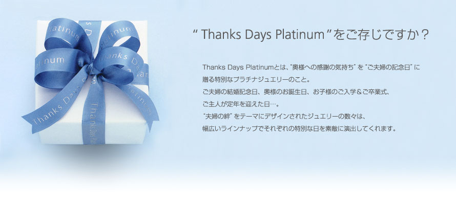 プラチナといっても、純度85%以上のものをプラチナジュエリーと呼びます。Thanks Days Platinumでは、高純度90%以上のプラチナだけを採用。奥様への純粋な愛を表現しているのです。